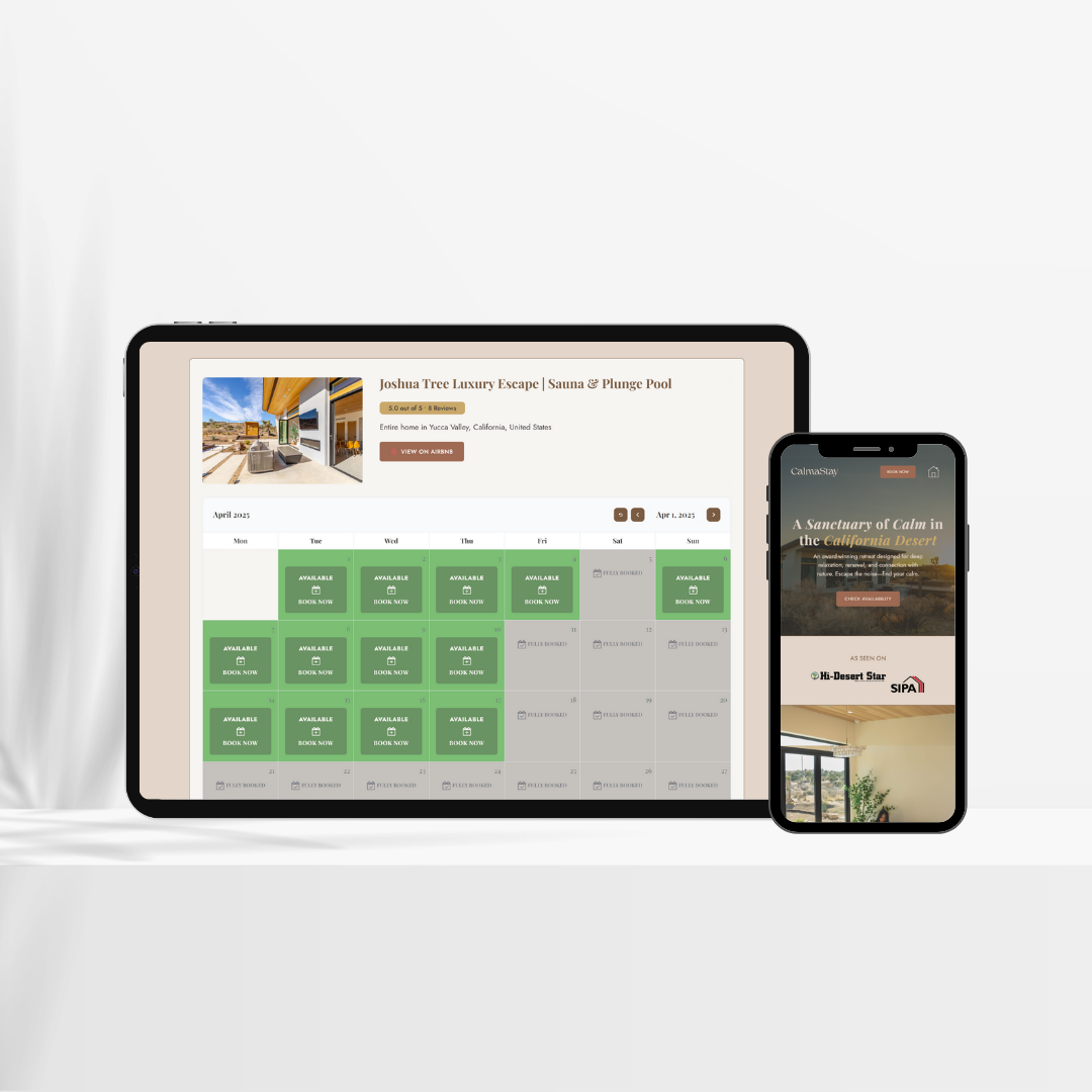 We designed a visually immersive Squarespace website highlighting CalmaStay’s breathtaking surroundings and premium features like panoramic desert views, private sauna, and hot tub. The platform combines stunning photography, intuitive navigation, and seamless UX to create an online experience that mirrors the retreat’s luxury and tranquility. Integrated real-time Airbnb booking and review widgets make it easy for visitors to check availability and read guest feedback, enhancing trust and driving conversions.