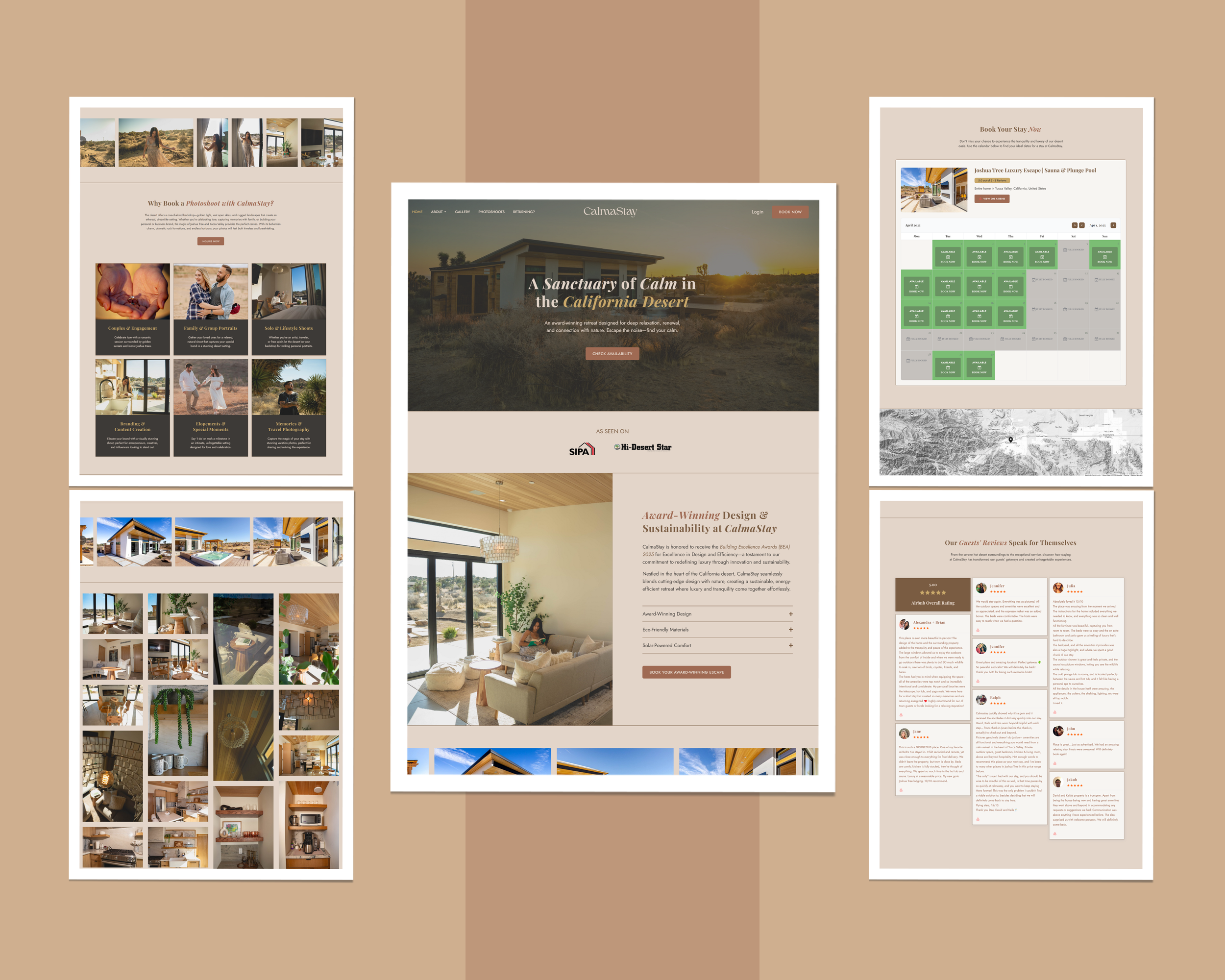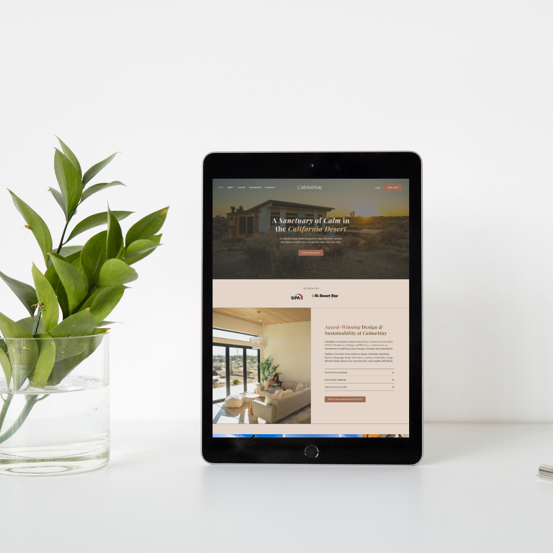 We crafted an immersive Squarespace site that captures CalmaStay’s luxury, tranquility, and sustainability, showcasing its breathtaking desert retreat, seamless amenities, and real-time booking tools to inspire visitors and drive reservations.