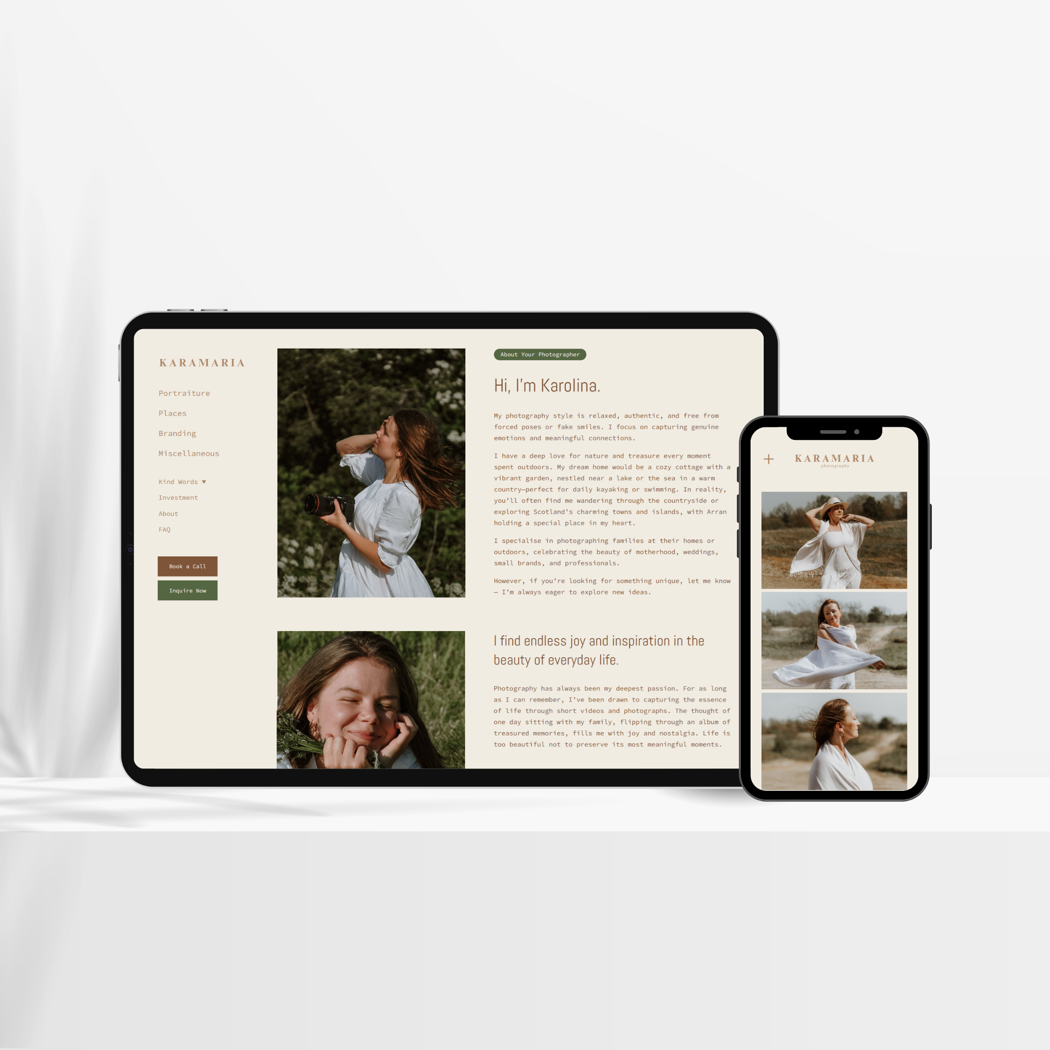 Kara Maria, a Glasgow-based lifestyle, motherhood, family, and wedding photographer, needed an online platform that could authentically reflect her artistry: capturing genuine emotion and the beauty of real-life moments. The challenge was to design a website that felt intimate, warm, and human, while maintaining professional clarity and effortless usability for clients looking to book sessions or explore her work.